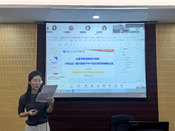 在内容讲解中,余教授结合自身丰富的科研经历与指导经验,从选题逻辑、实践语料构建、理论框架建立到案例分析方法,逐步讲解MTI论文写作的关键环节,帮助学生厘清论文写作中的痛点与堵点。整个报告内容深入浅出、结构清晰,为MTI研究生明确了从规范迈向创新的可行路径。