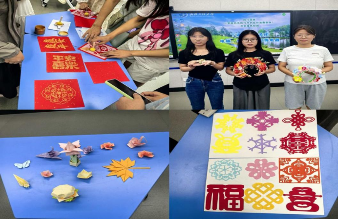 活动现场洋溢着浓厚的人文气息与青春活力。同学们以四至五人小组为单位,围绕不同主题进行精心策划与展示。各小组分工明确、配合默契,既展现了团队协作精神,也彰显了个人特长与创意。展示内容丰富多彩:中华美食组带来了酒酿汤圆、春卷、芡实糕等传统点心的制作与品鉴;手工艺组则精彩呈现了剪纸、折纸、簪花、拓印、中国结等技艺。各小组均设置了体验环节,邀请现场师生共同参与制作。许多同学第一次尝试剪纸、编中国结或制作传统点心,在动手实践中深切感受到中华文化的博大精深与无穷趣味。贾文霞老师也表示:“文化不是静止的标本,而是活的、可感可触的实践。只有亲身体验,才能真正理解其内涵与价值。”