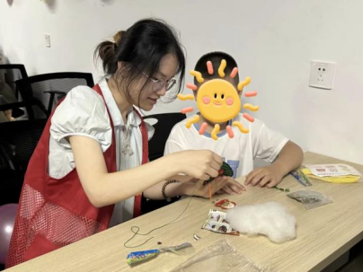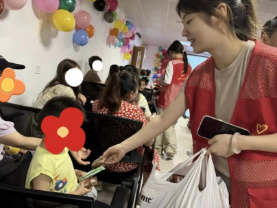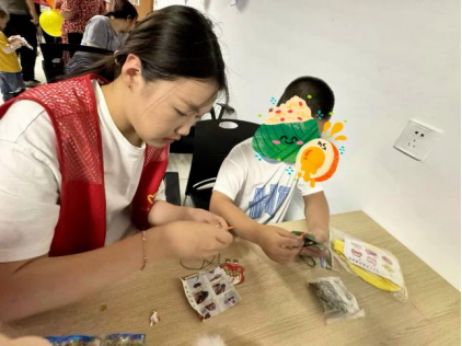 在充满传统文化气息的香囊制作环节,志愿者们来到孩子身边,成为耐心的“小助手”。他们将准备好的布料、艾草、流苏穗摆放好,带领小朋友们认真地选布、填艾草、装饰香囊。尽管制作的香囊不是十分精致,但是每一个都装满了孩子们的心意。那一个个小小的香囊,蕴藏着对端午安康的祝福和对未来的期许,更承载着康复路上温暖的陪伴。