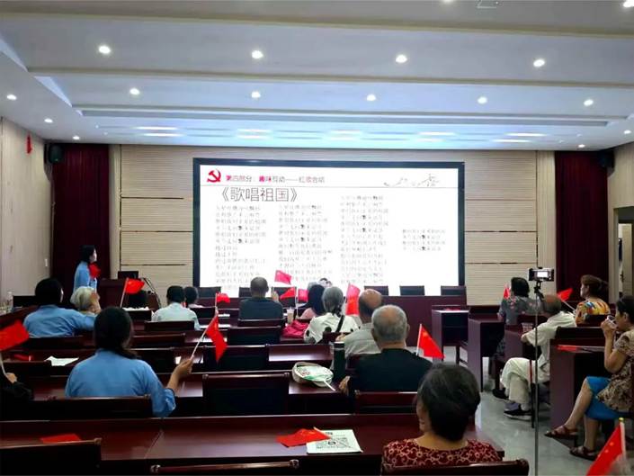 为增添活动的趣味性,外语学子们设计了歌曲联唱互动环节。在激昂的旋律中,《歌唱祖国》《我和我的祖国》等经典红色歌曲响起,现场观众手持小红旗,随着节奏挥舞,齐声高唱。熟悉的旋律唤起了三代人对过往岁月的追忆,歌声中充满了对祖国的热爱与祝福,整个活动现场洋溢着爱国氛围。