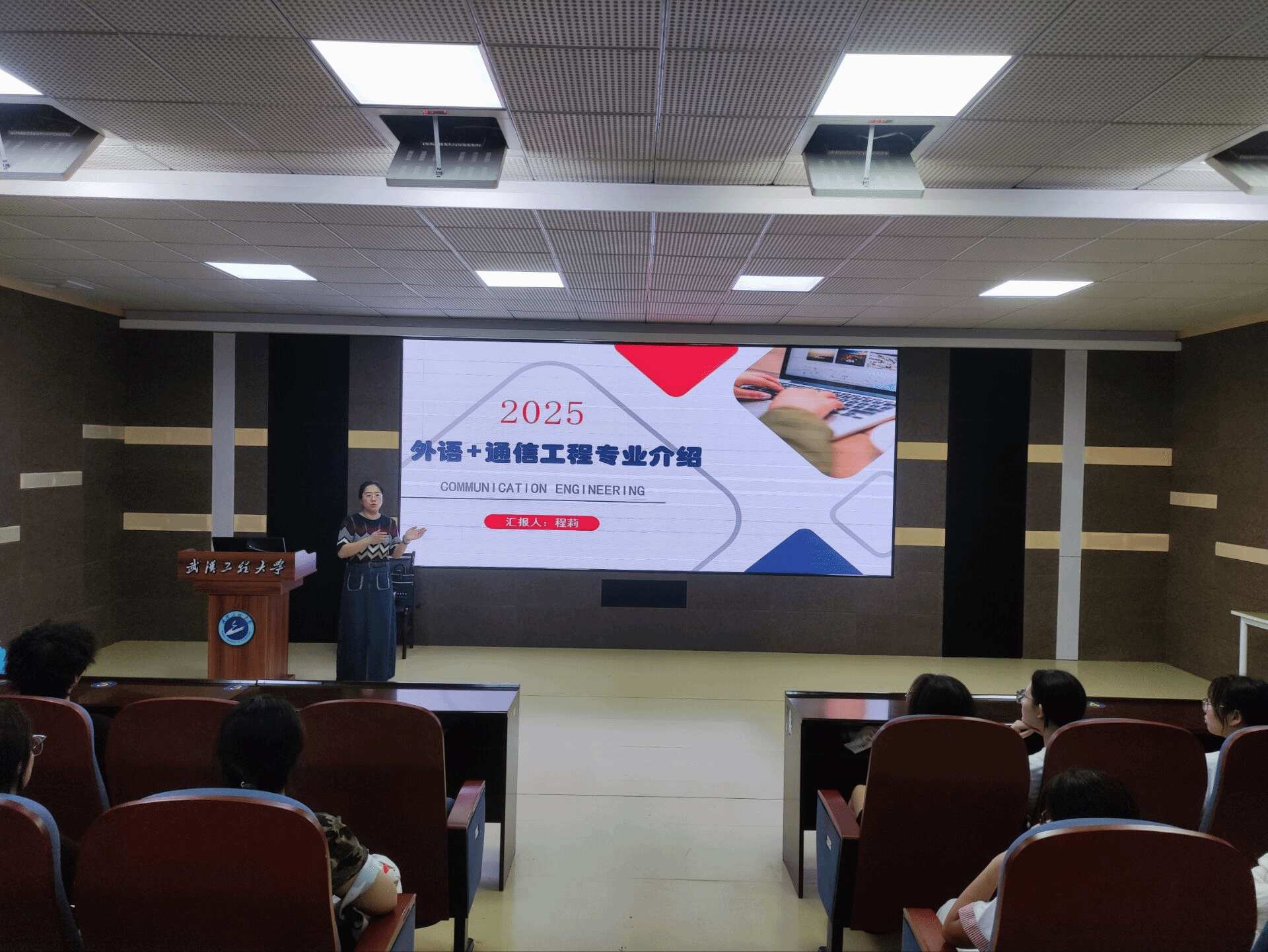 会议在同学们的期待中拉开了序幕。首先,程莉老师以“2025英语+通信工程专业介绍”为主题,从专业背景、课程体系、实践资源,就业前景等维度展开讲解,以通俗易懂的方式清晰的向大家解释了“通信工程专业到底是什么”“课程体系究竟是怎样”,同时承诺通信工程专业的所有课程和教学资源,包括先进硬件设备和资深师资指导,共享给同学们,全方位保障学生专业能力培养,让同学们切实感受到学校在专业建设上的硬核投入与育人诚意,加强了学生对该专业的理解。
