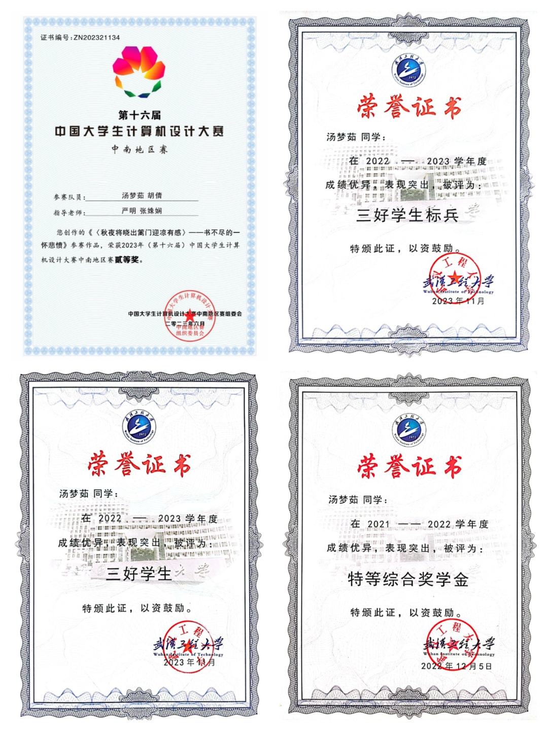 大学期间先后获得特等学业奖学金、一等学业奖学金,获评校级“三好学生”、“三好学生标兵”等多项荣誉称号;获得中国大学生计算机设计大赛微课赛道中南赛区二等奖、“高教社杯”全国商务英语实践赛全国大学生商务英语语言能力三等奖等竞赛奖项;带领团队入选“推普助力乡村振兴”全国大学生暑期社会实践志愿服务活动团队,获得湖北省“三下乡”社会实践优秀团队等;担任学校校史馆讲解员,参加了武汉网球公开赛、武汉马拉松等大型志愿赛事的志愿服务活动,累计志愿时长300余小时。